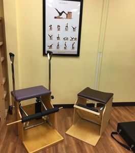 This apparatus was invented by Joseph to allow clients to perform his Reformer routine in their small NYC apartments. Flip it over and it would add additional seating. A challenging piece of equipment, this is typically used in private and semi-private/duet sessions with the more advanced client or a client that may need be challenged in a weight bearing position to improve balance. Exercises can be performed sitting, standing, or on top or around the chair.